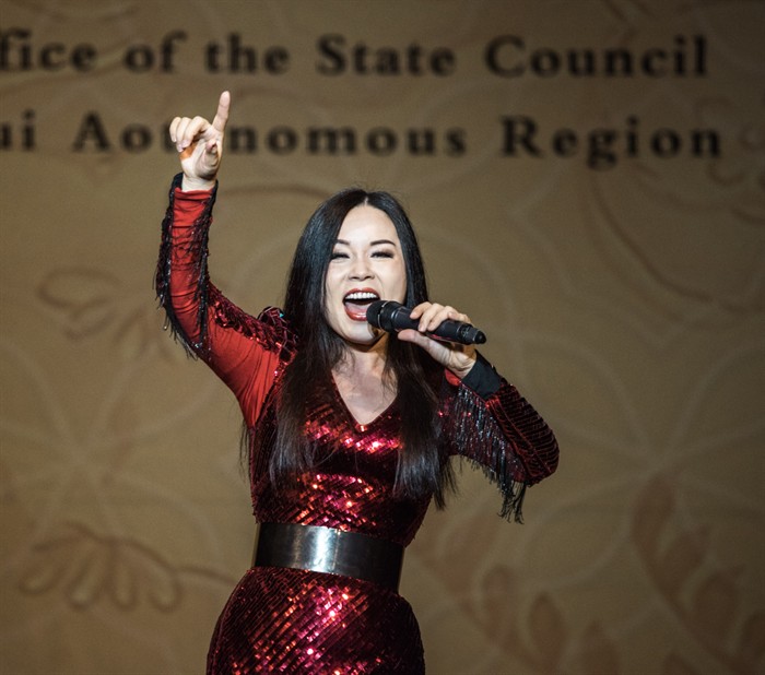 足之蹈之,歌之舞之。当你久盼乡情的心刚刚萌动起来,一曲纯正的哈萨克民歌《玛依拉变奏曲》又俘获了你的耳朵。国内青年歌唱家刘桐着一袭华美的旗袍,深情演唱“人人都叫我玛依拉,诗人玛依拉……”,这全世界耳熟能详的曲调,将中国少数民族文化汇聚成的大中国文化风景,又一次陶醉了炎黄子孙的心。在掌声中,演员又倾情演唱了《如意东方》,即应景又激动人心。